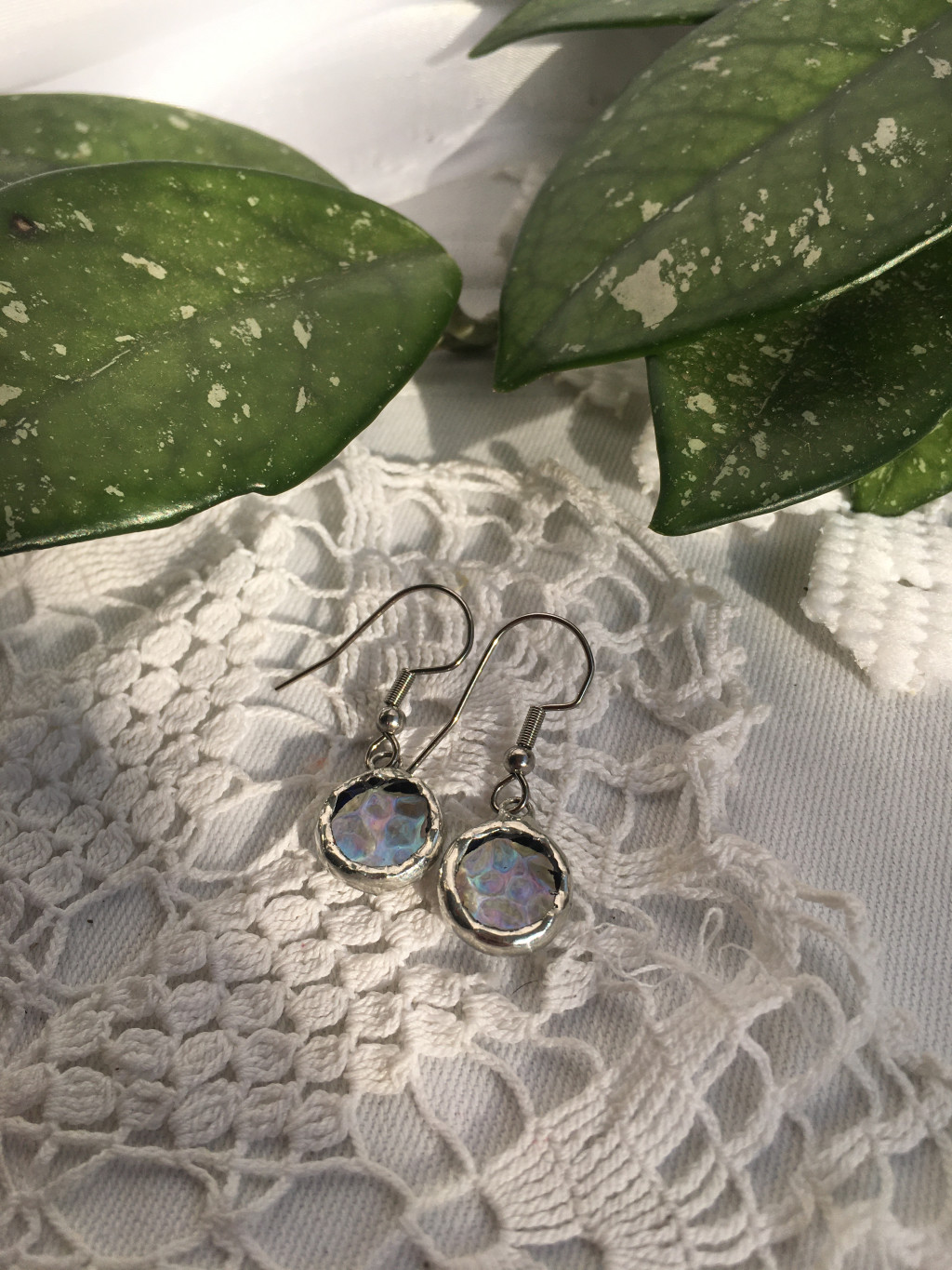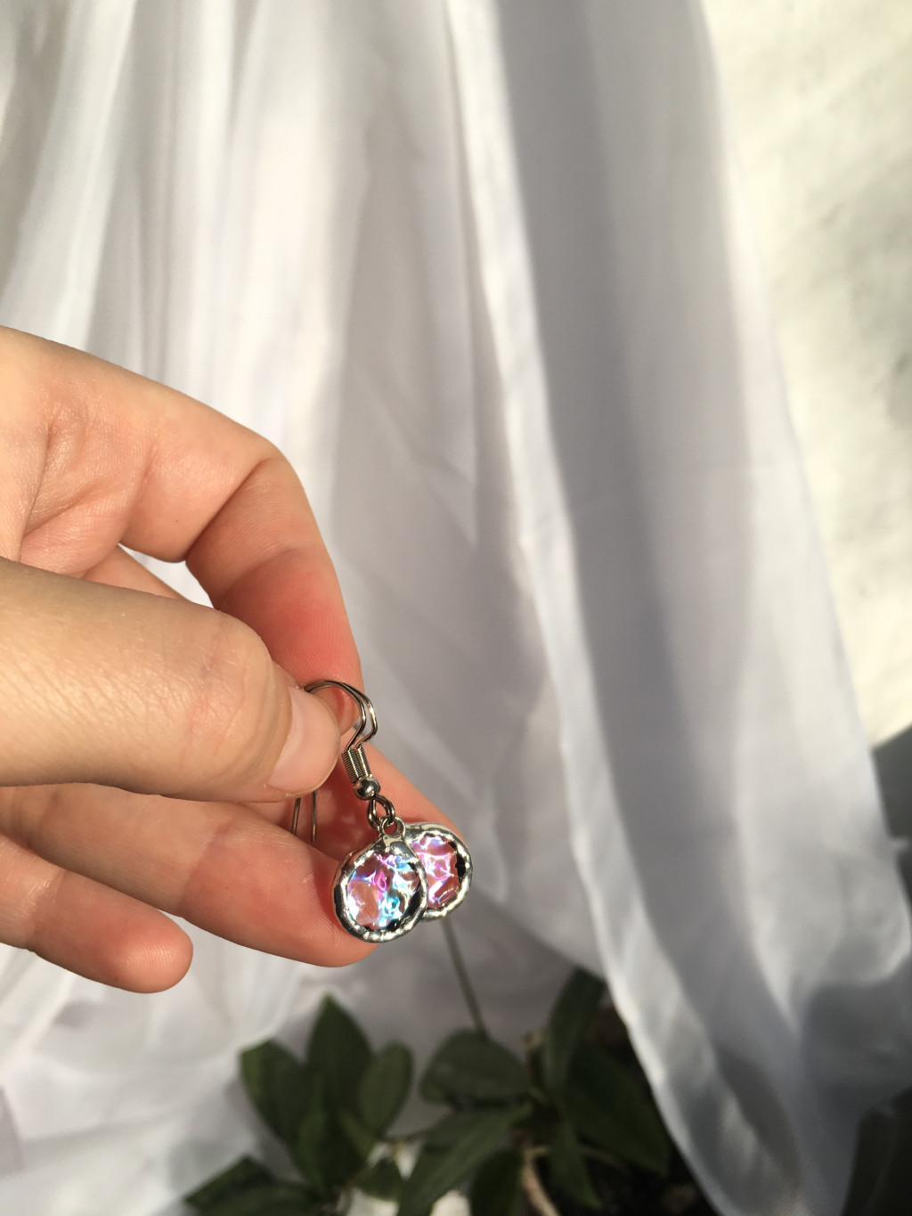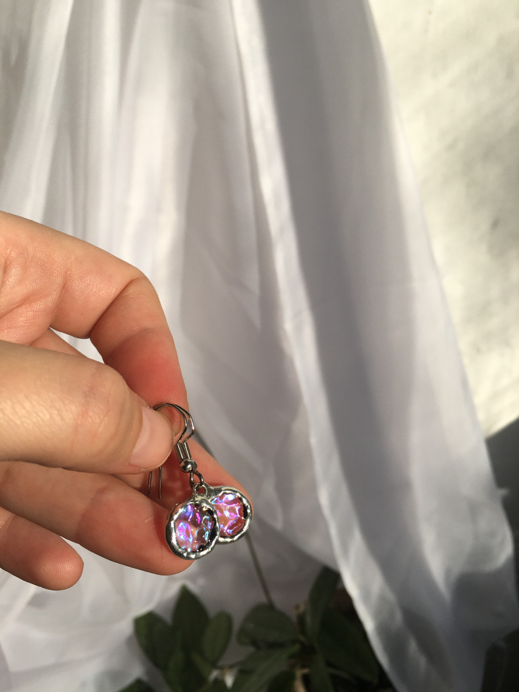 Rózsaszínes irizáló üvegből készült háromszög alakú átlátszó fülbevaló.