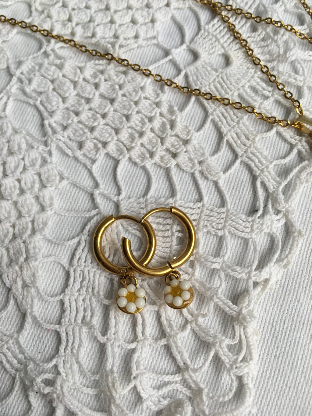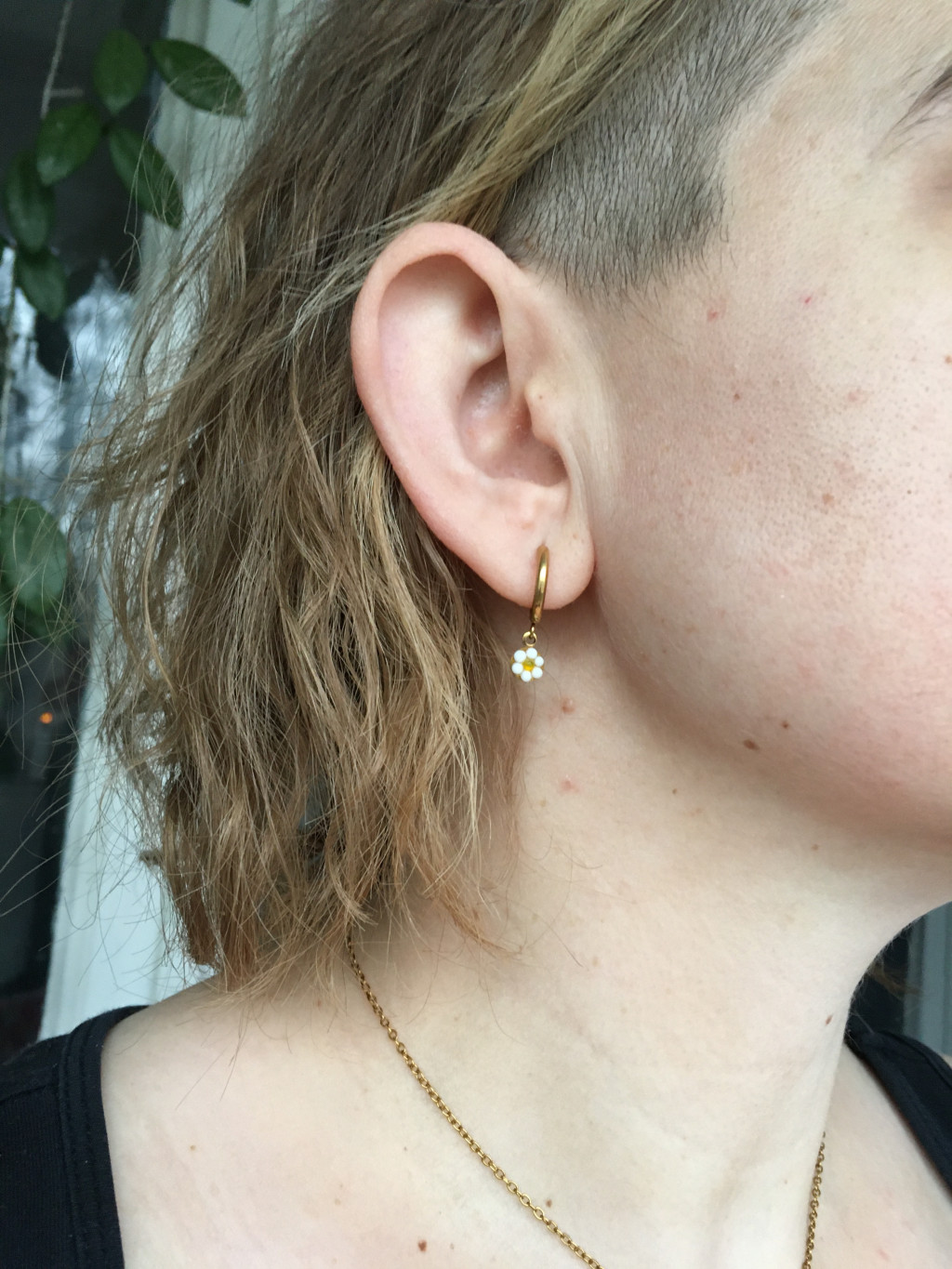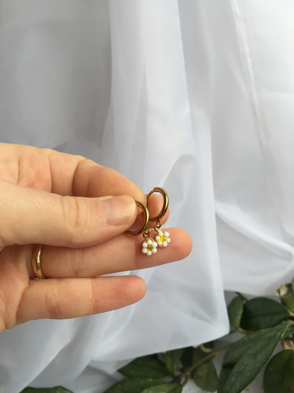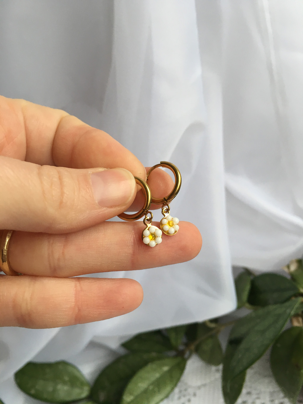 Margaréta kisvirág fülbevaló törmeléküvegből. A kisvirágok között a készítés jellege miatt apróbb eltérések lehetnek.
