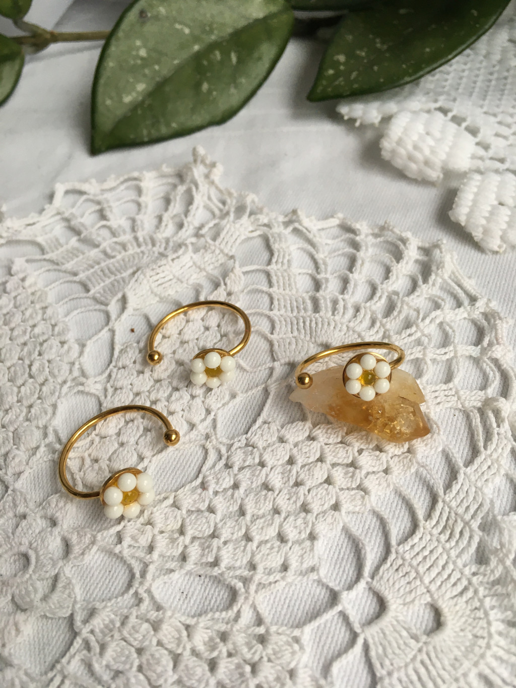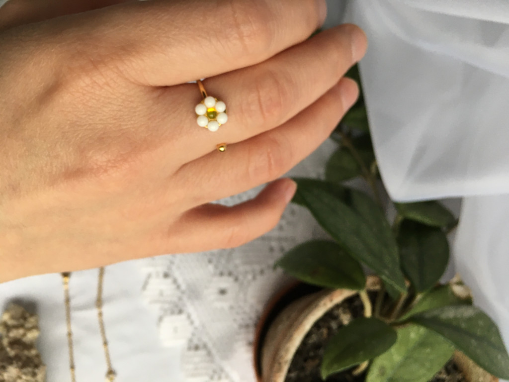 Margaréta kisvirág gyűrű törmeléküvegből. A kisvirágok között a készítés jellege miatt apróbb eltérések lehetnek.