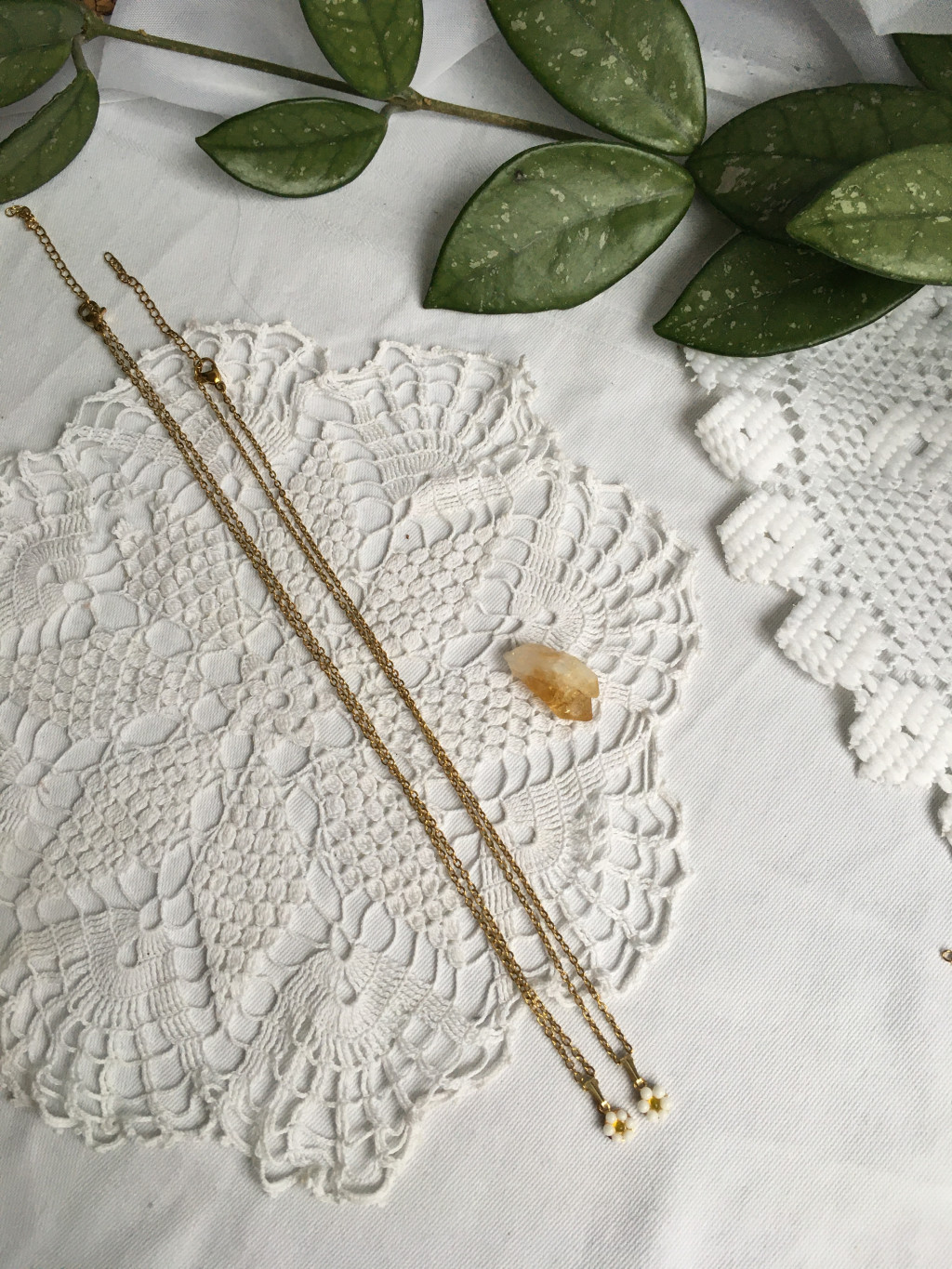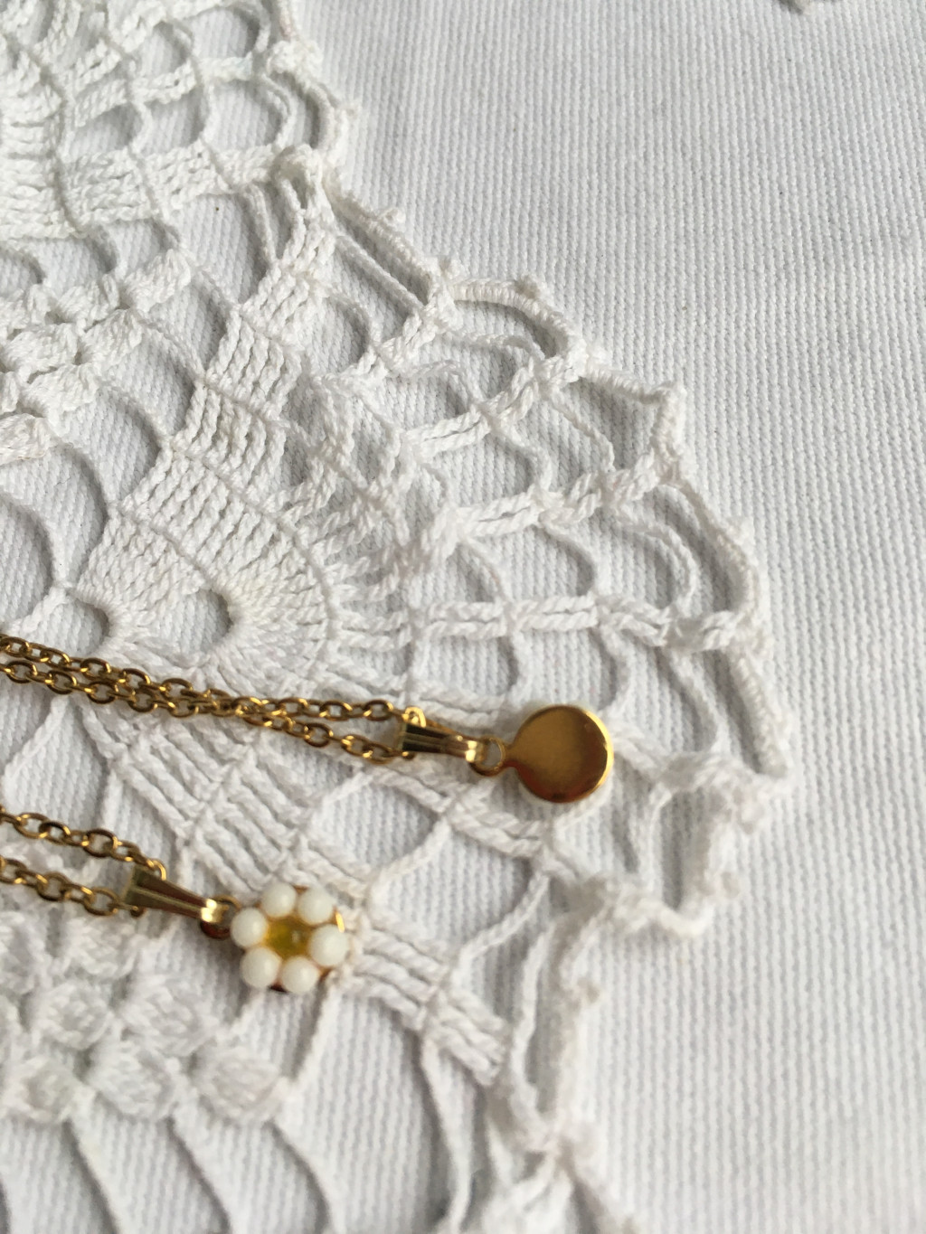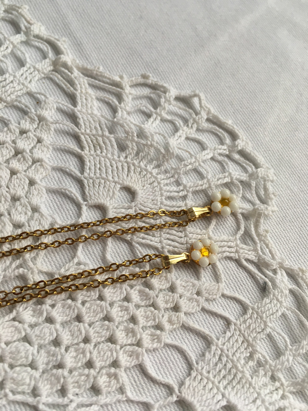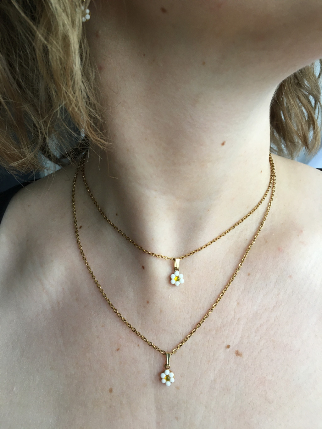 Margaréta kisvirág nyaklánc törmeléküvegből, két méretben. A kisvirágok között a készítés jellege miatt apróbb eltérések lehetnek.